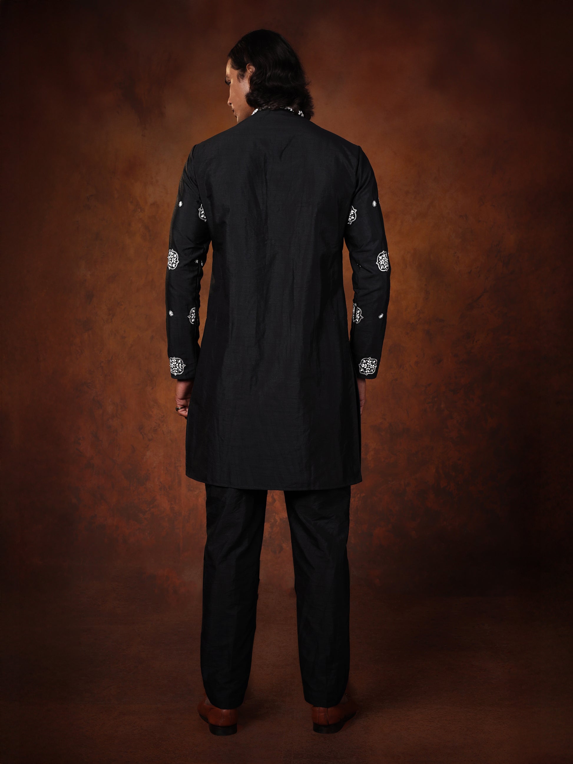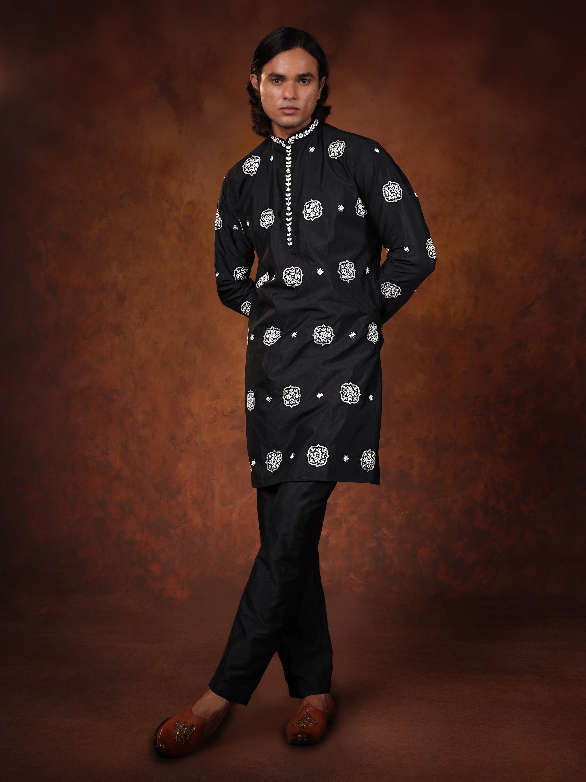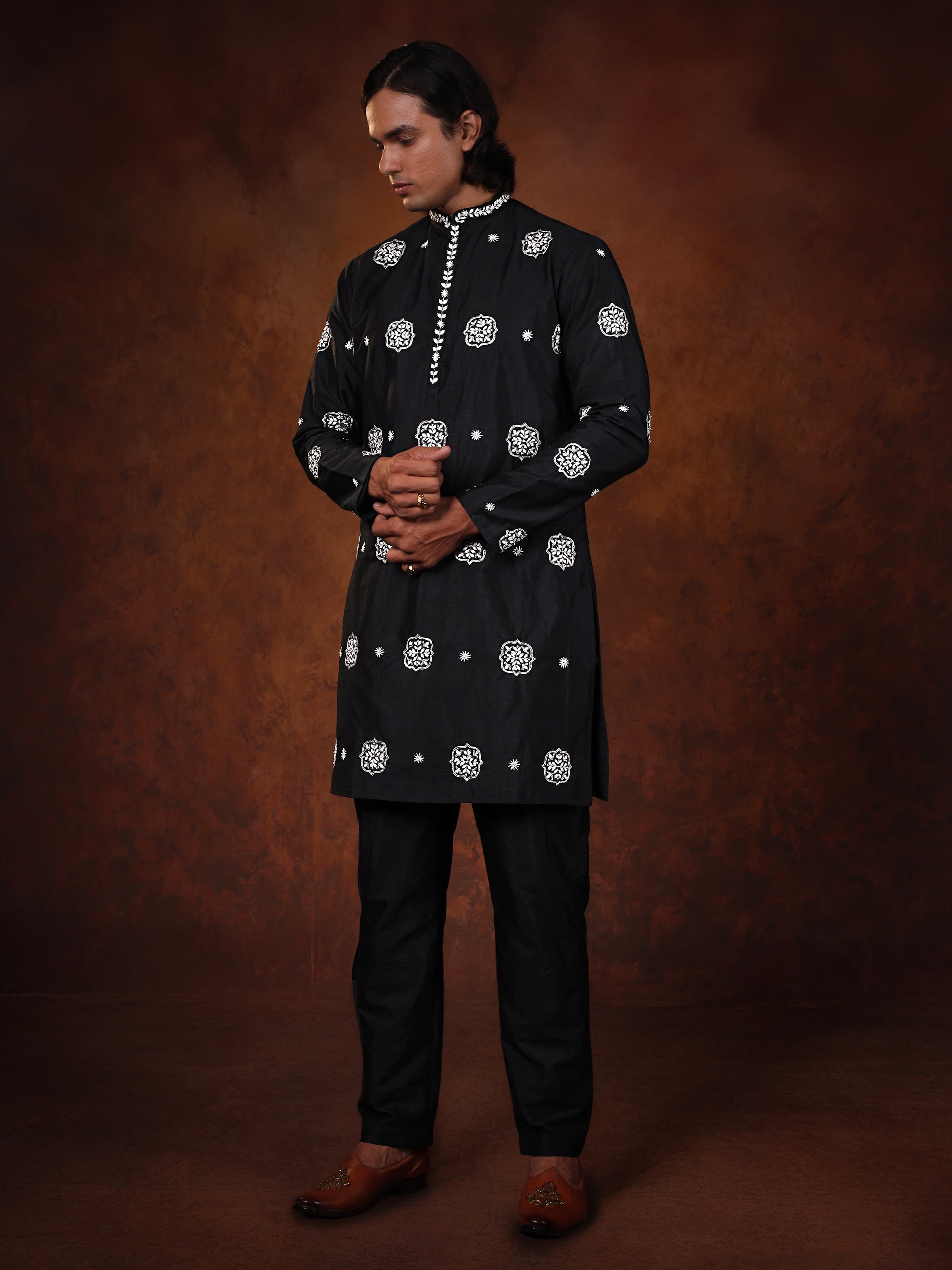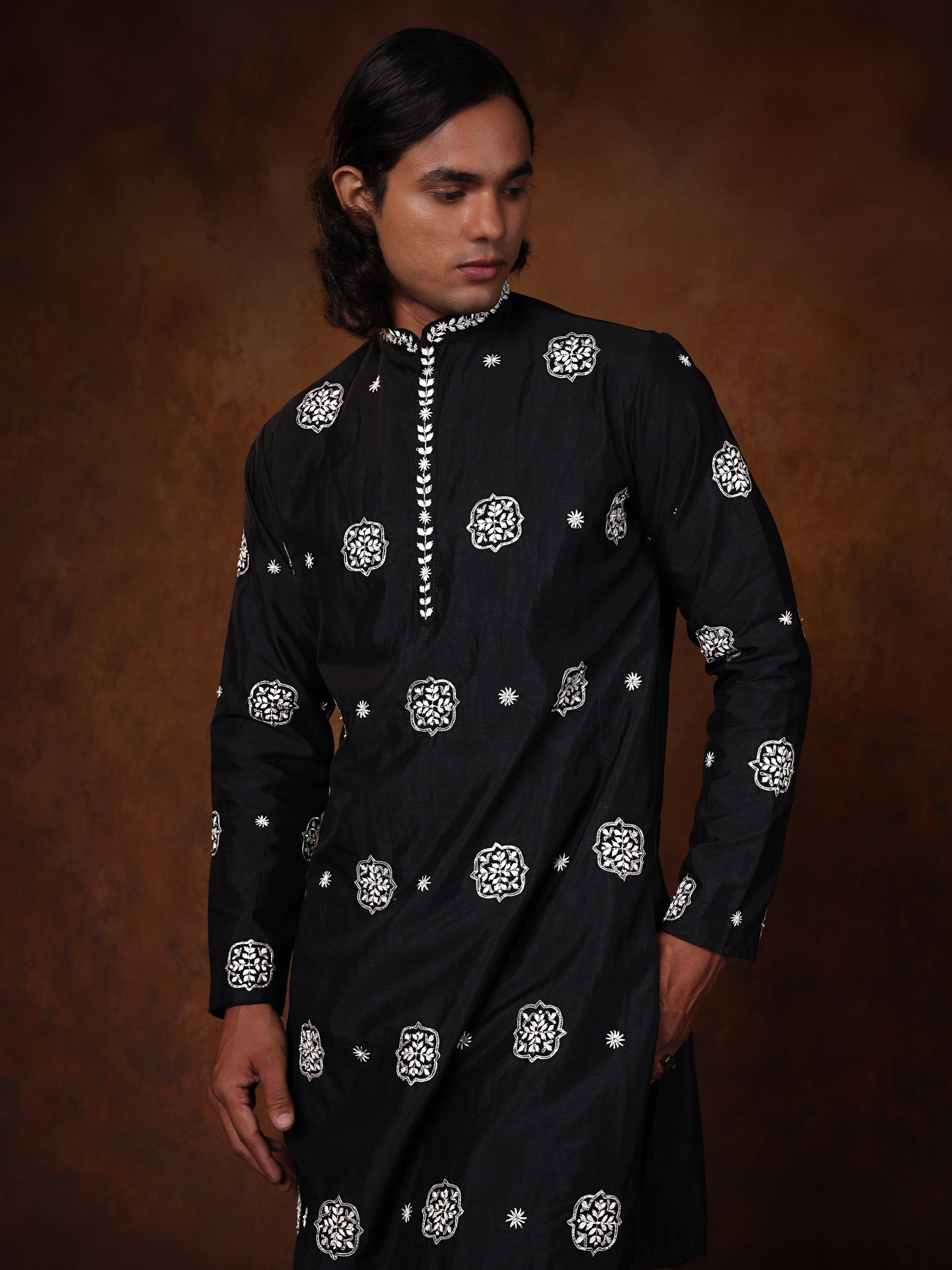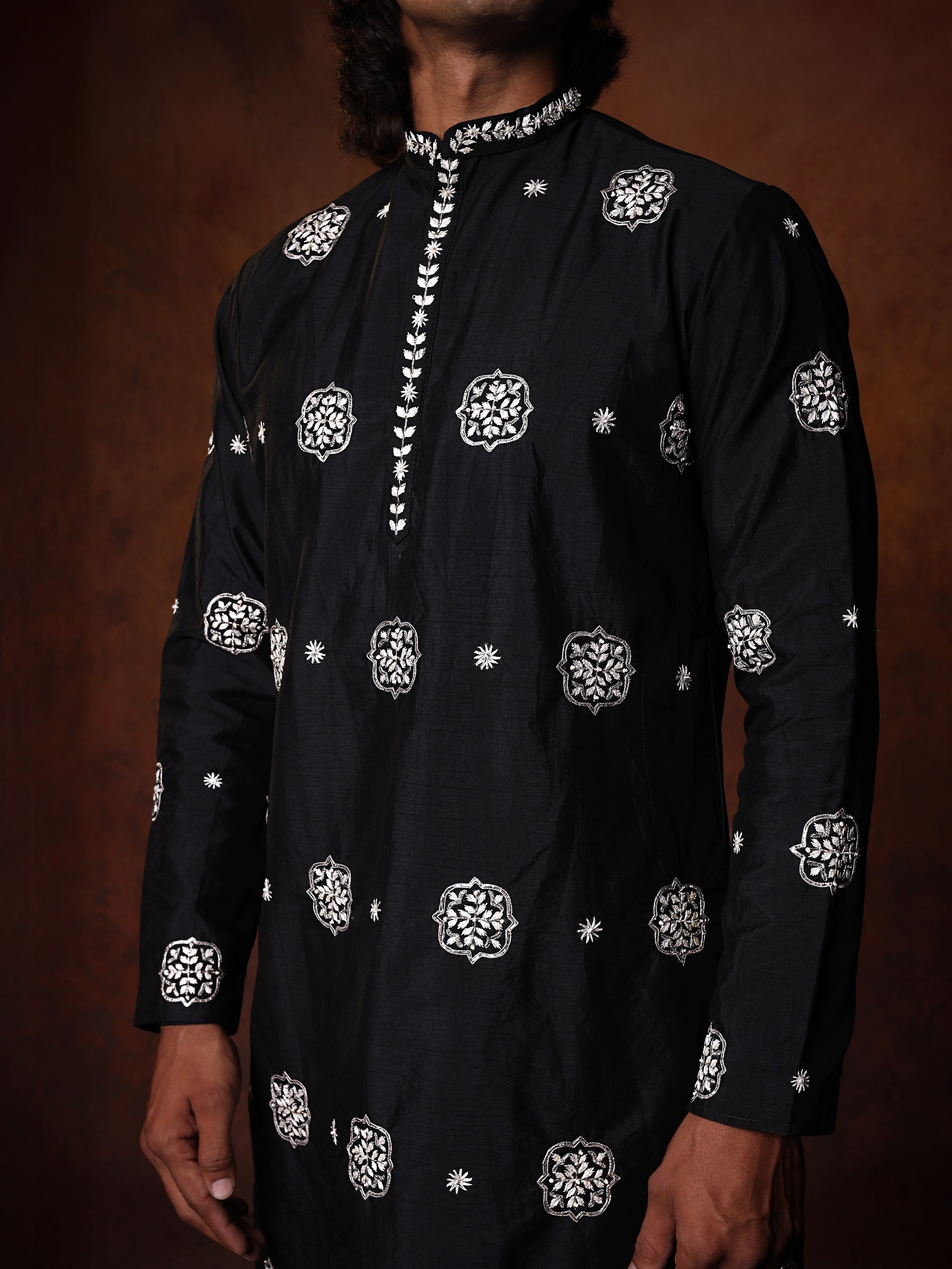 Black Dupion Silk Kurta Set with Hand-Embroidered Motifs