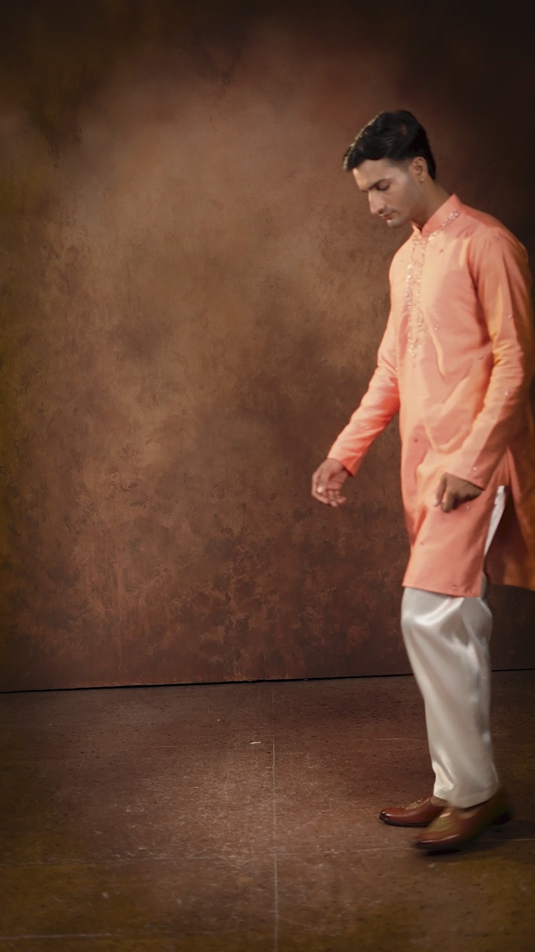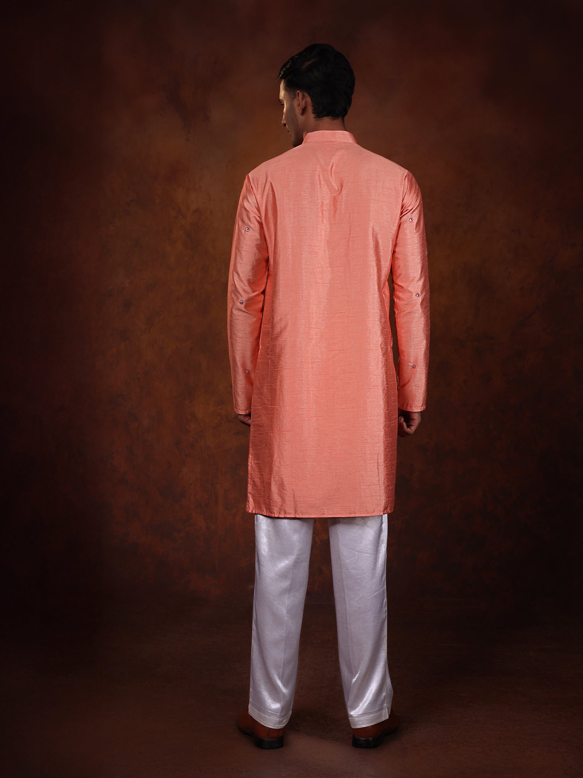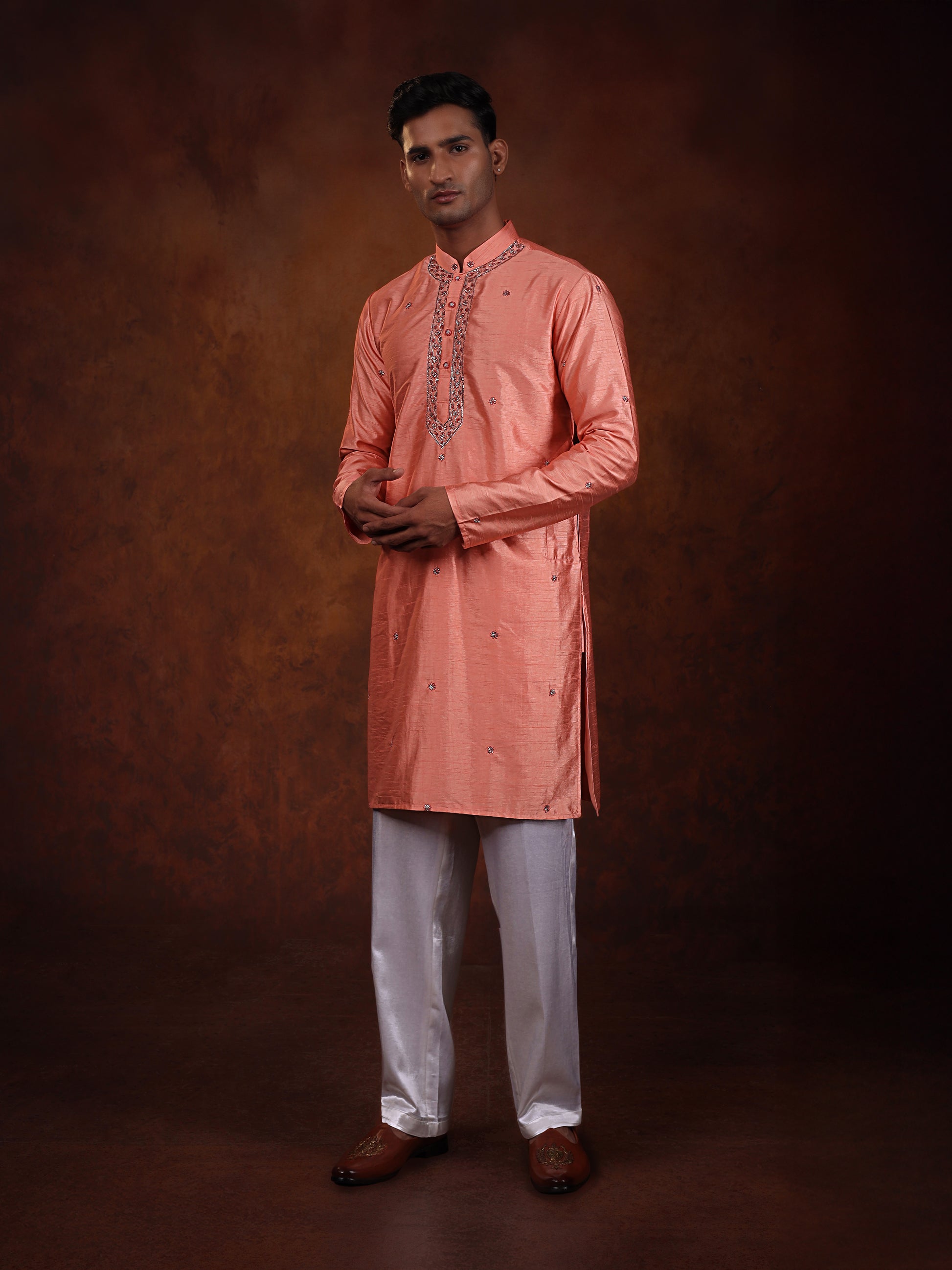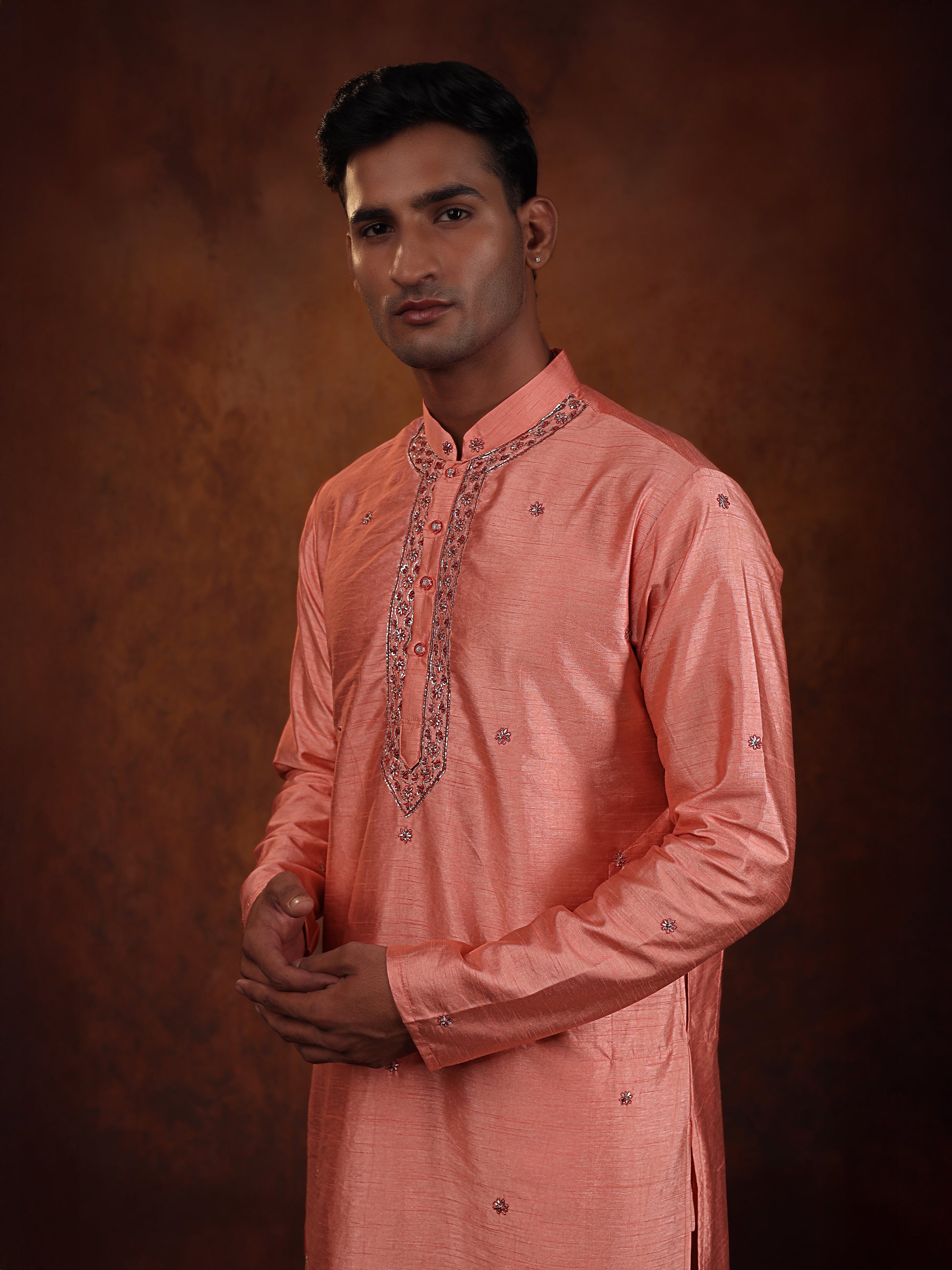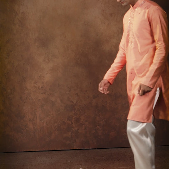 Soft and graceful, this coral silk kurta features delicate embroidery along the neckline and scattered motifs across the fabric. Its subtle shine adds elegance, making it a refined choice for day celebrations or pre-wedding events.✨