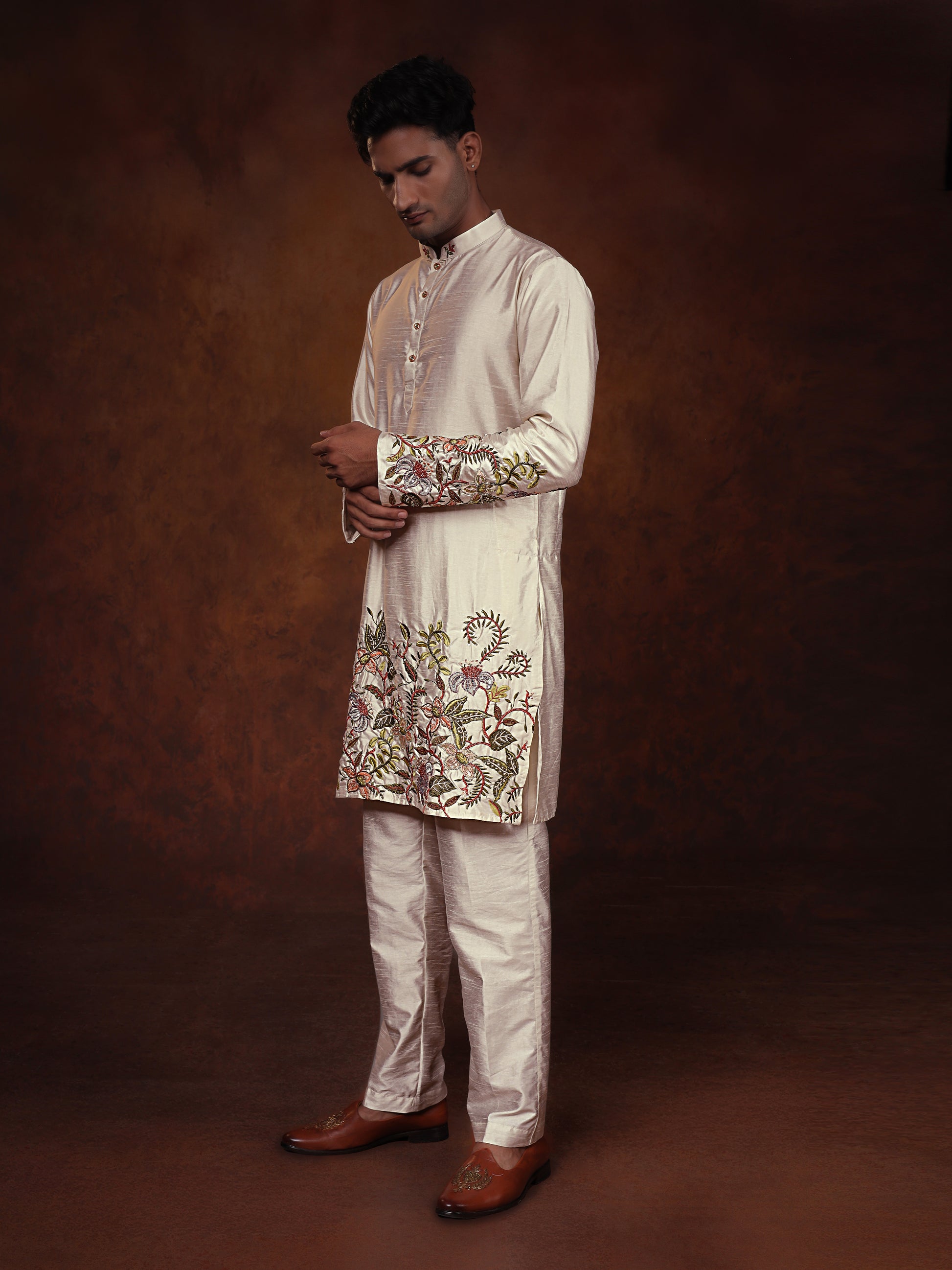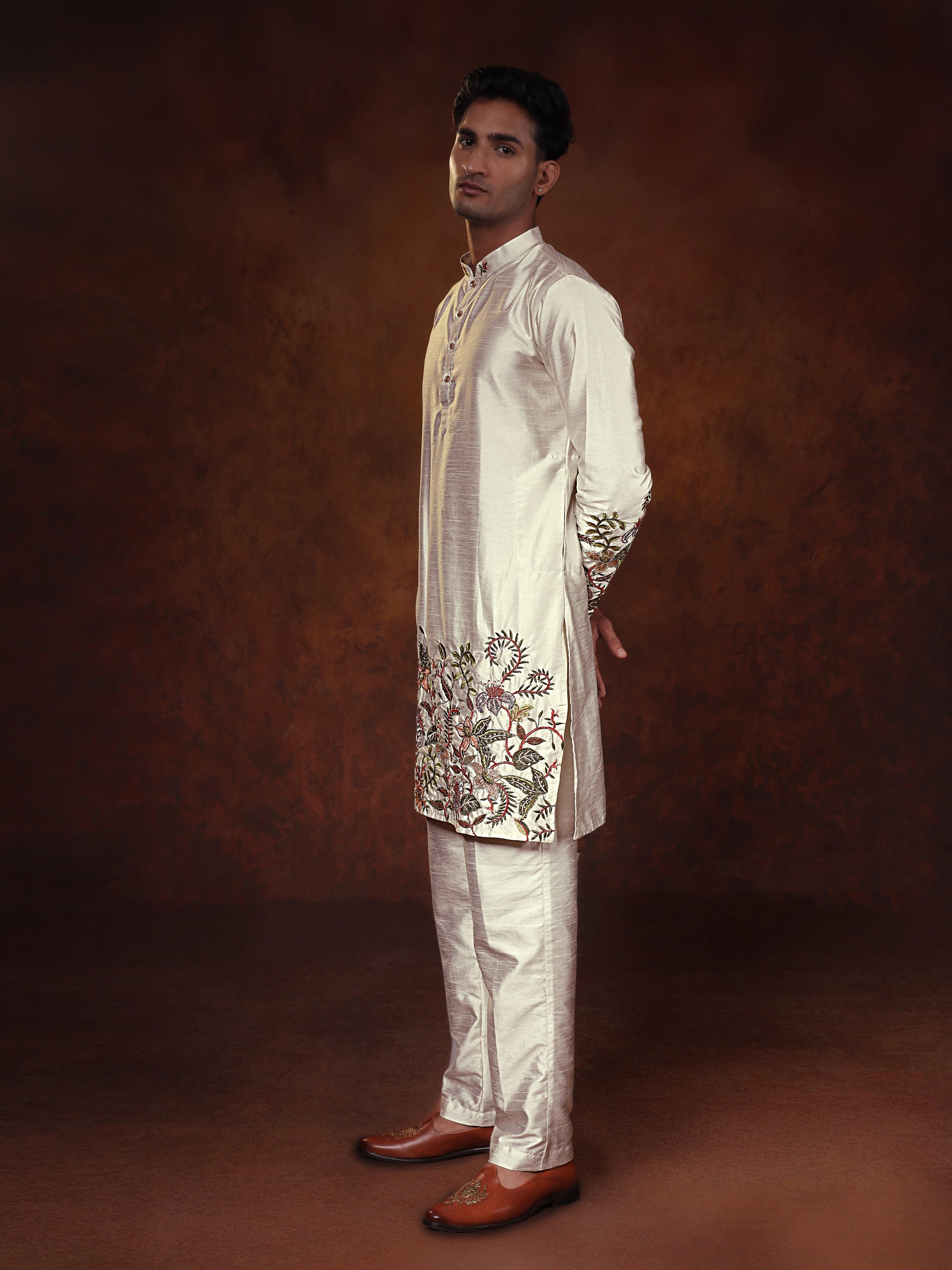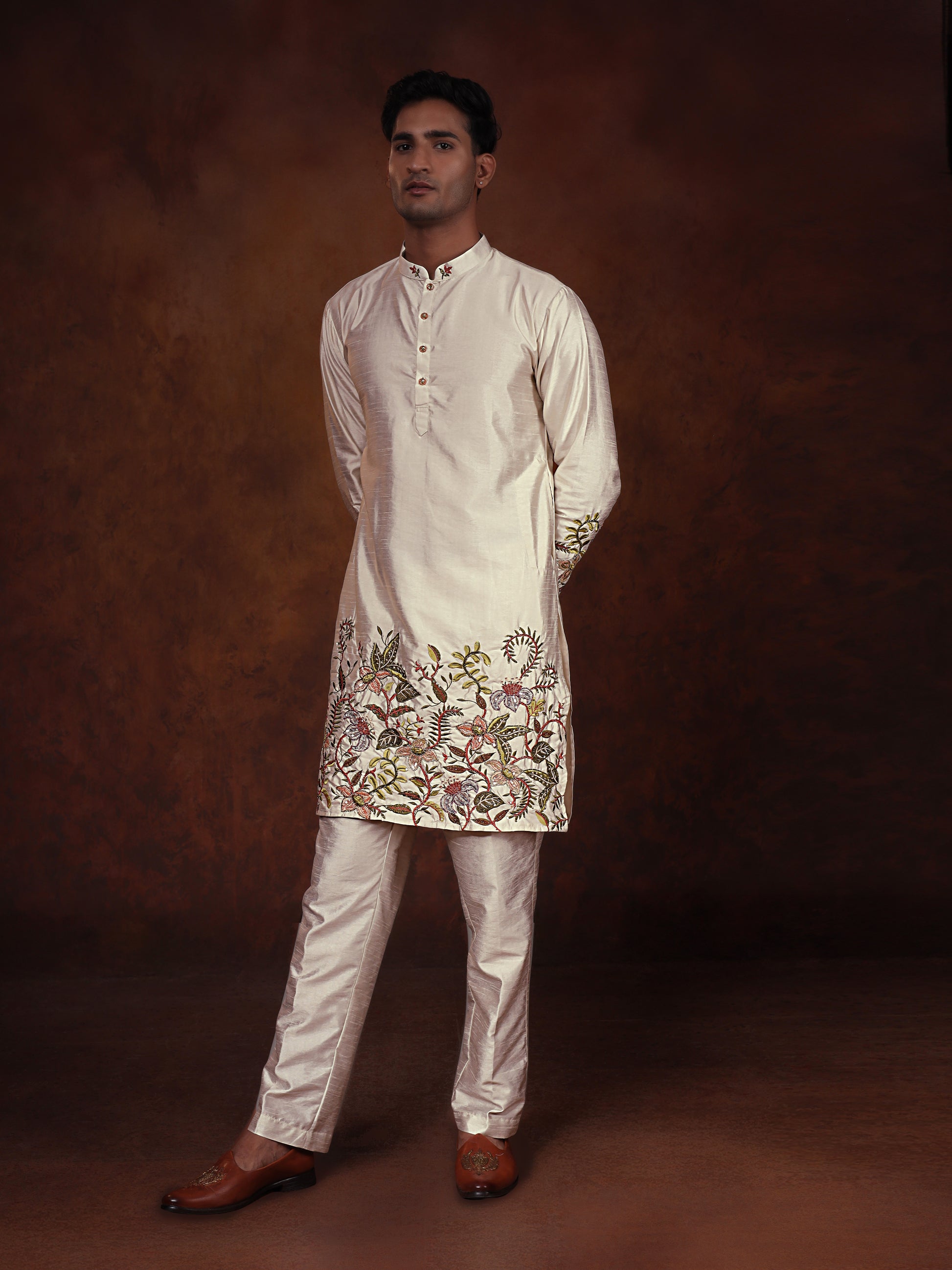 Off White Dupion Kurta With Flower Embroidered Kurta Set For Man