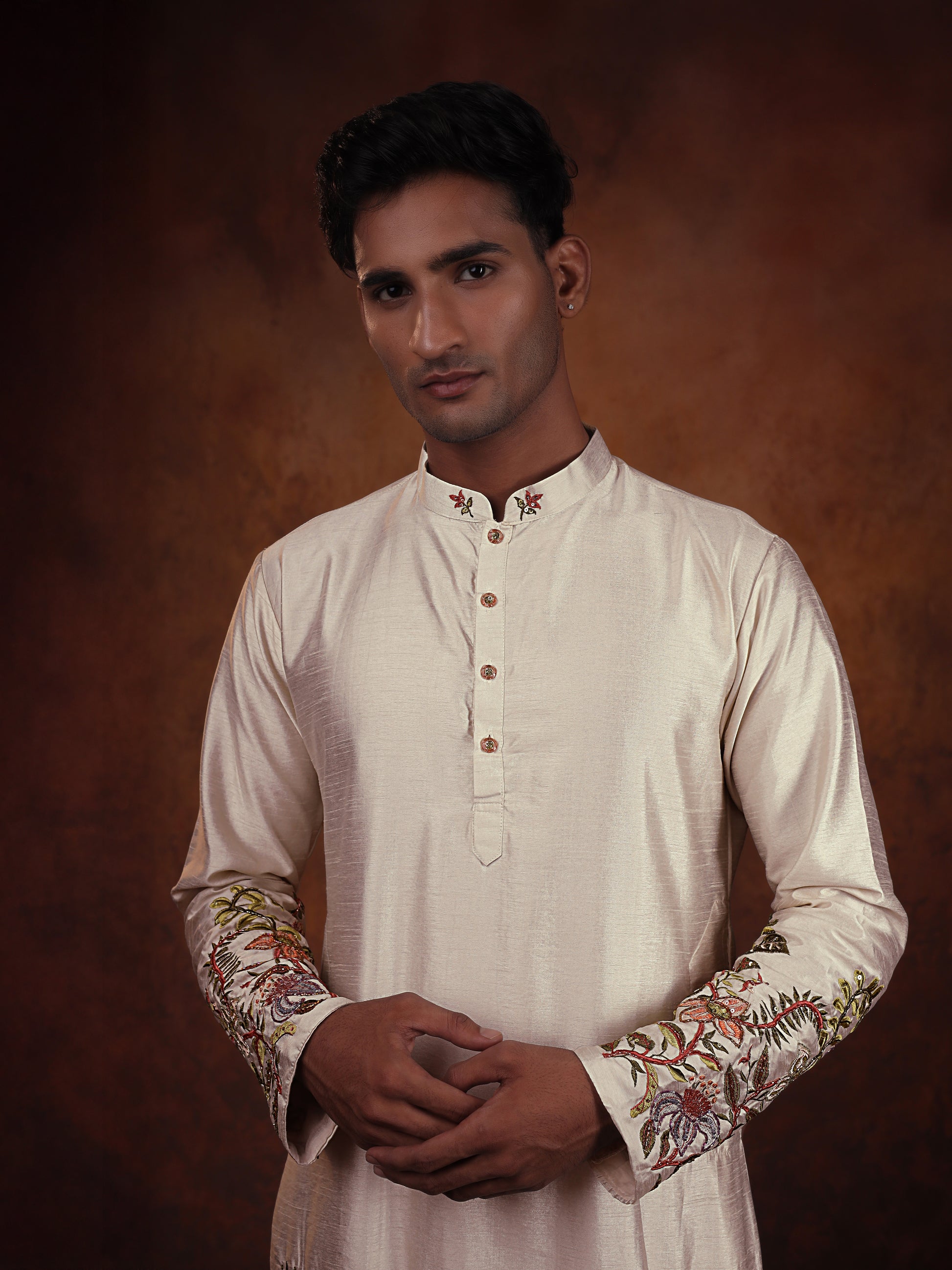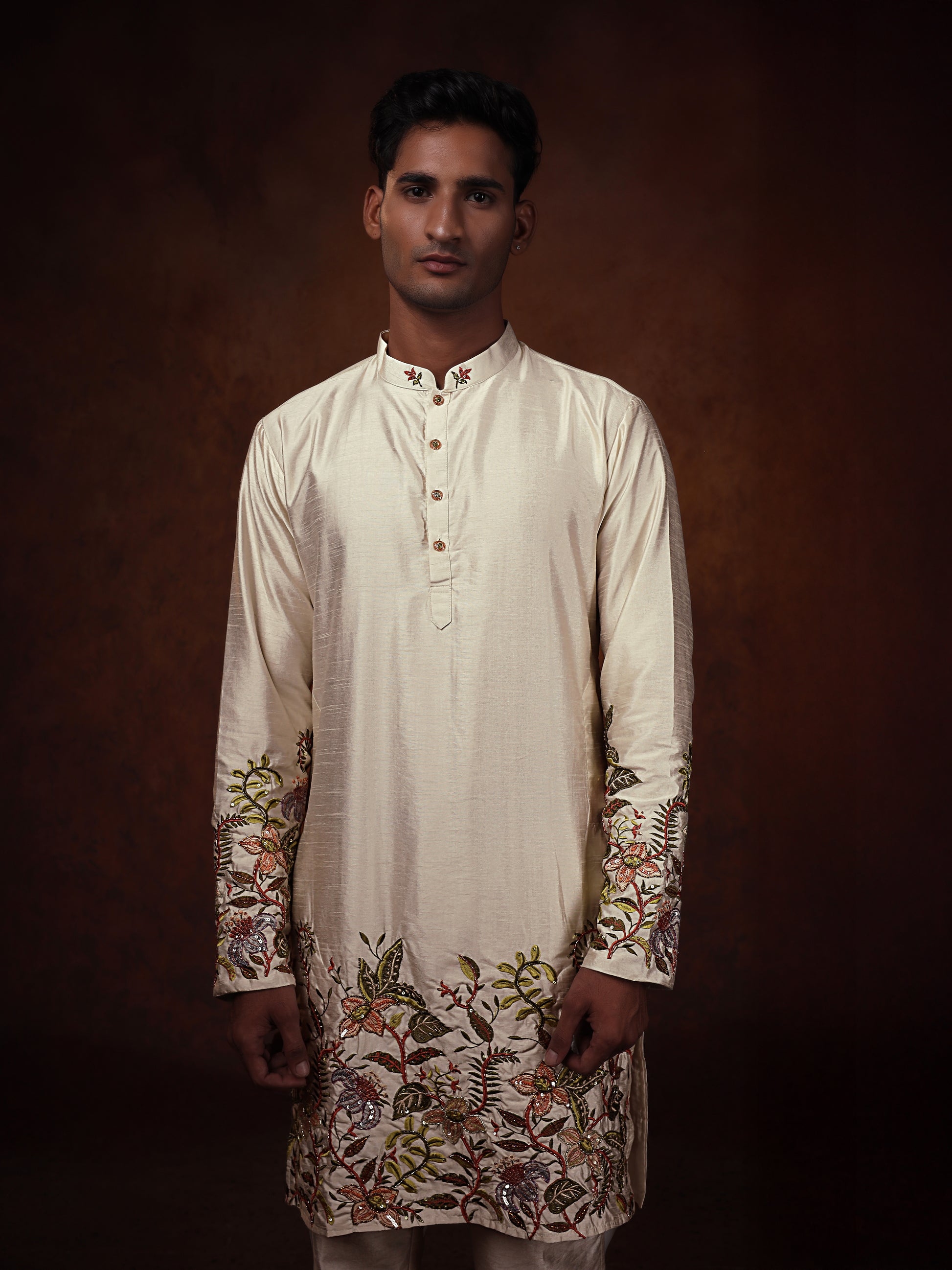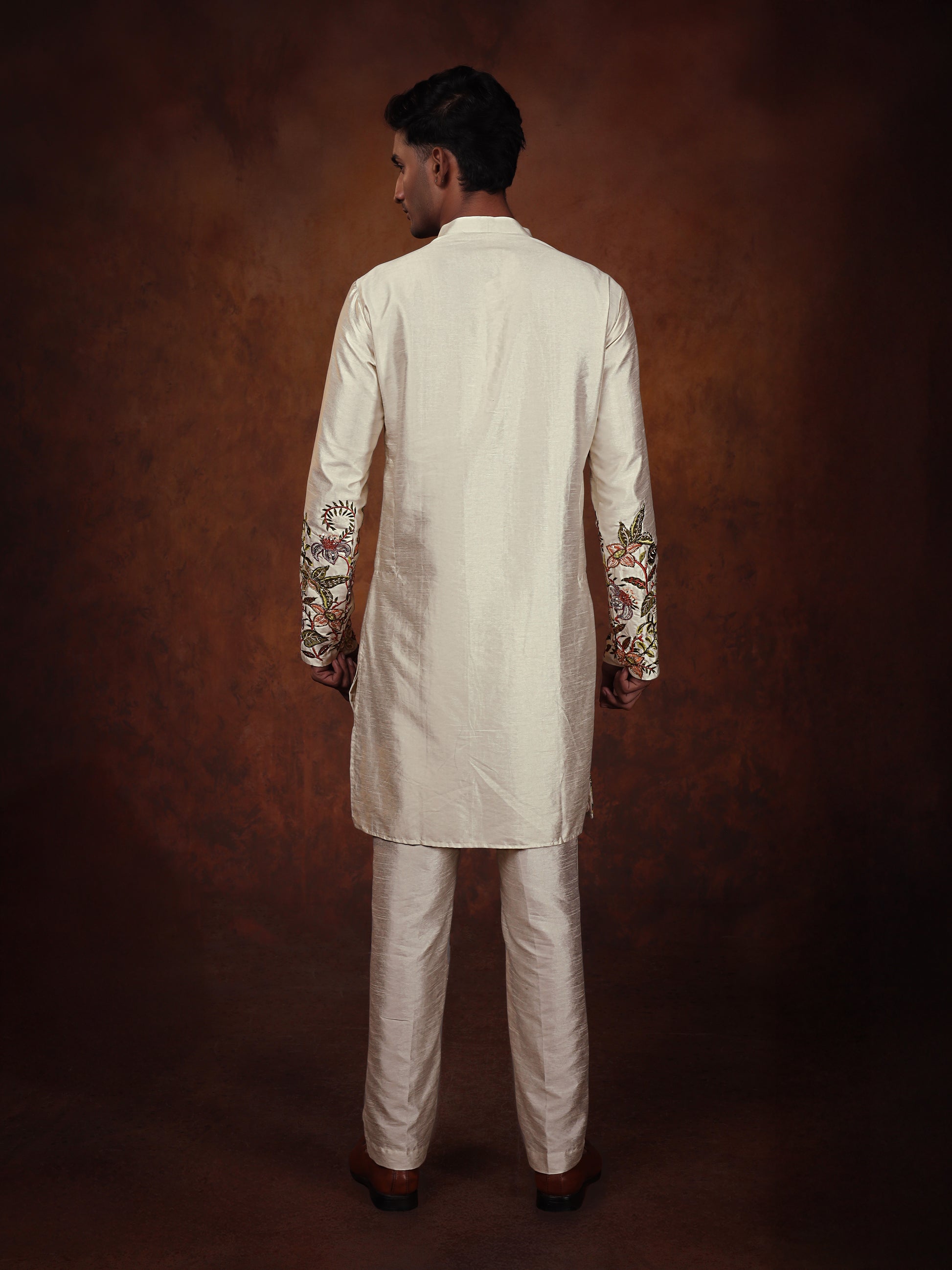 Off White Dupion Kurta With Flower Embroidered Kurta Set For Man
