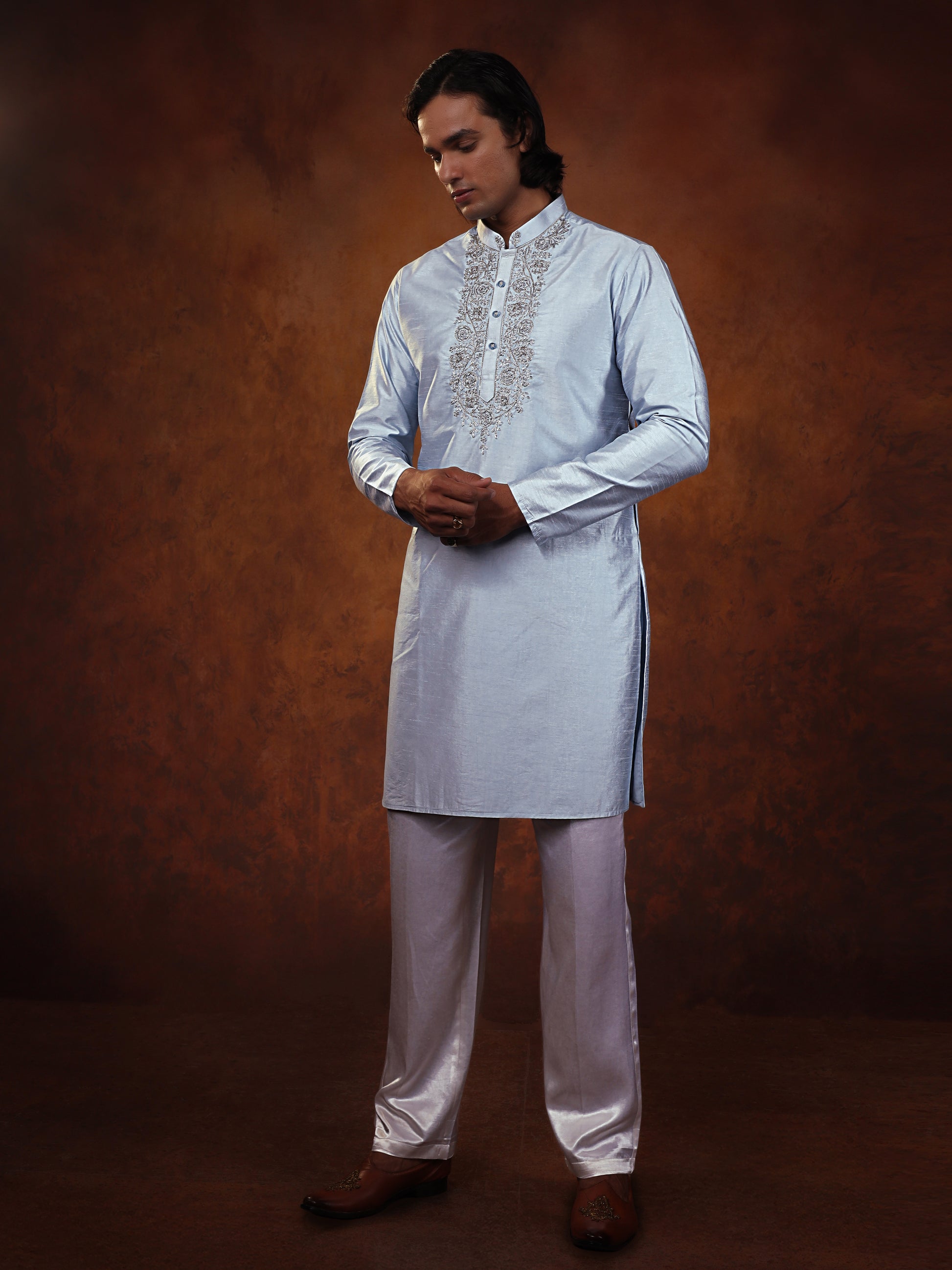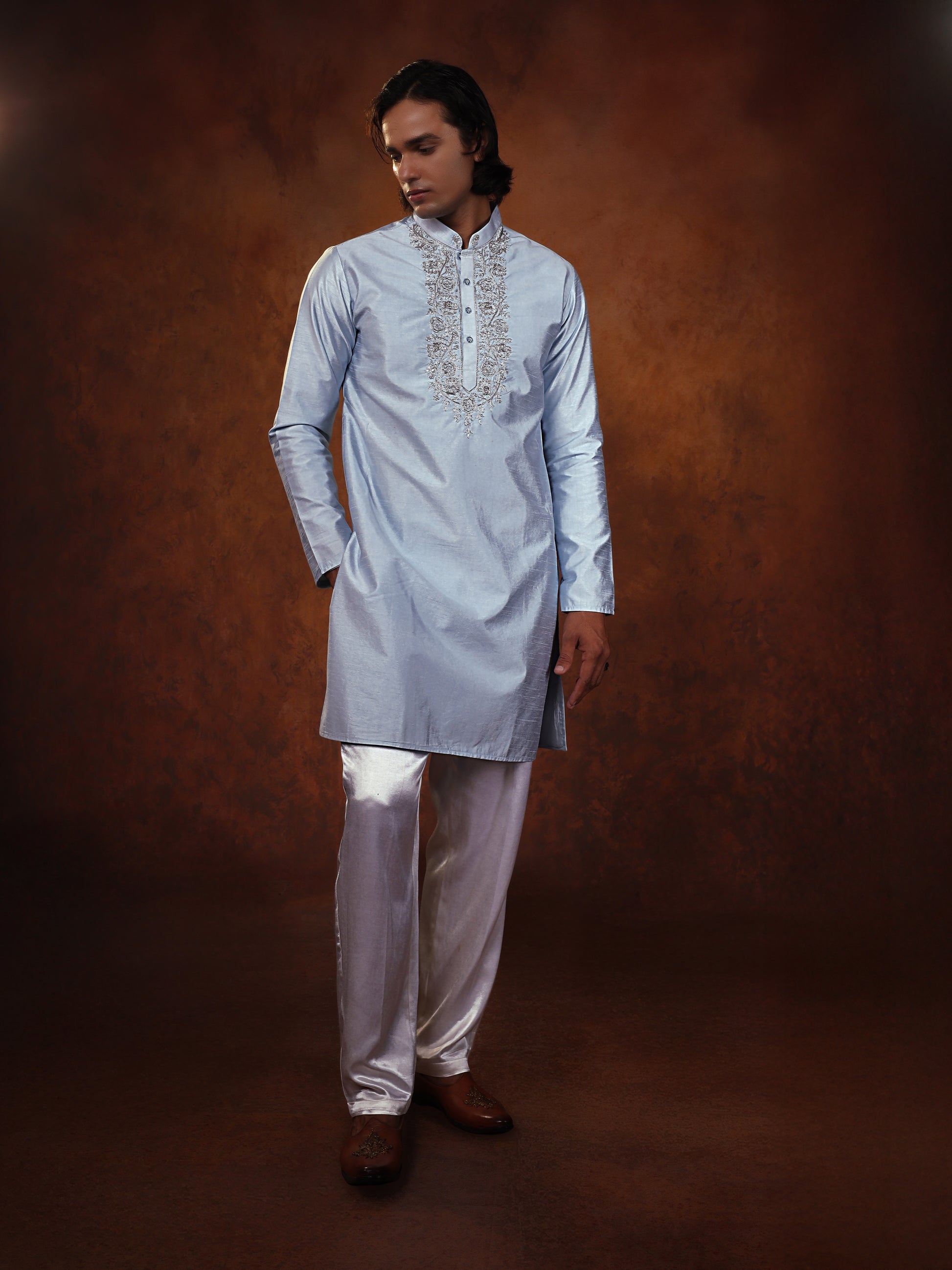 Cool and sophisticated, the powder blue kurta is designed with intricate embroidery around the placket, giving it a classy yet modern appeal. Ideal for evening functions, receptions, or any festive occasions.✨