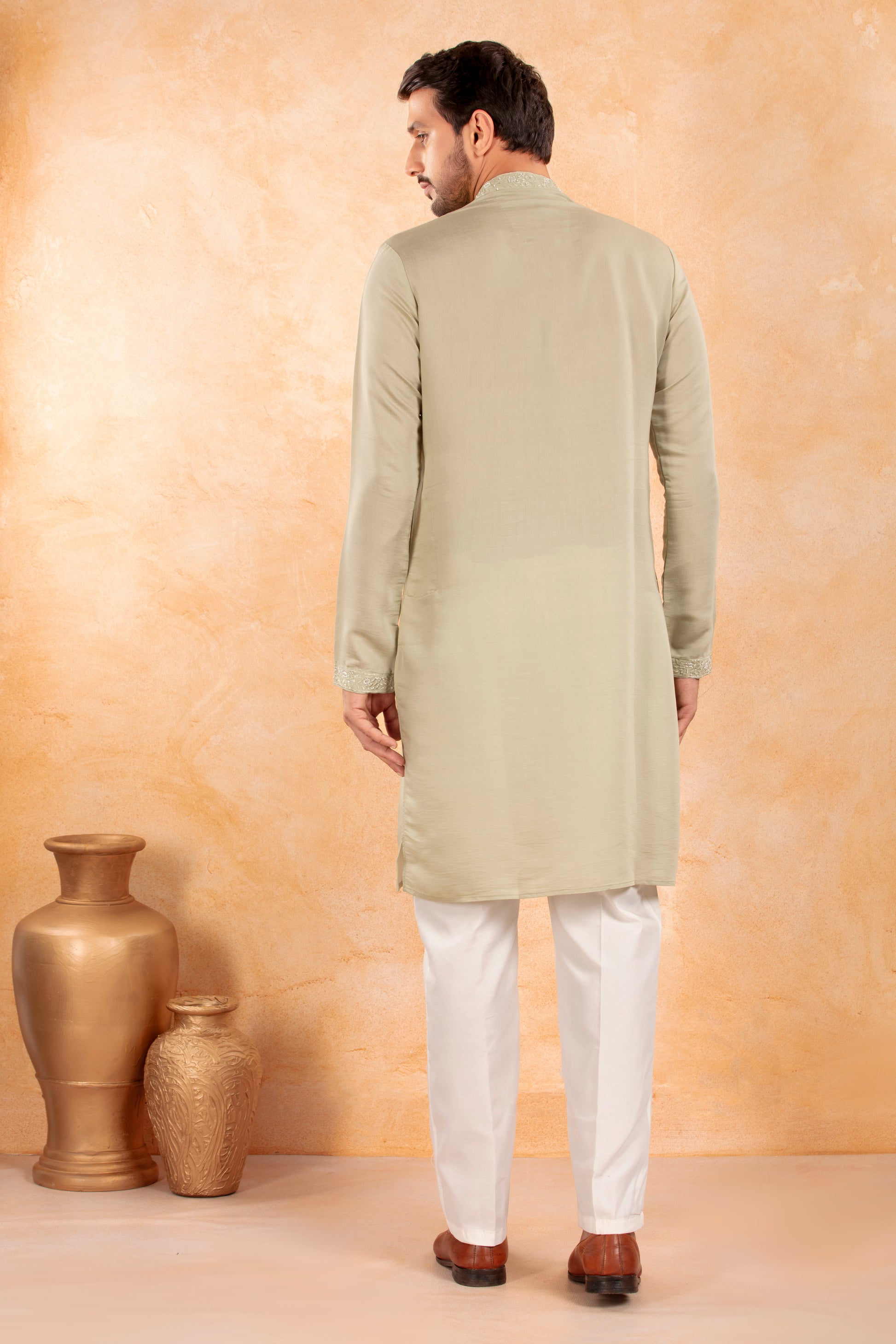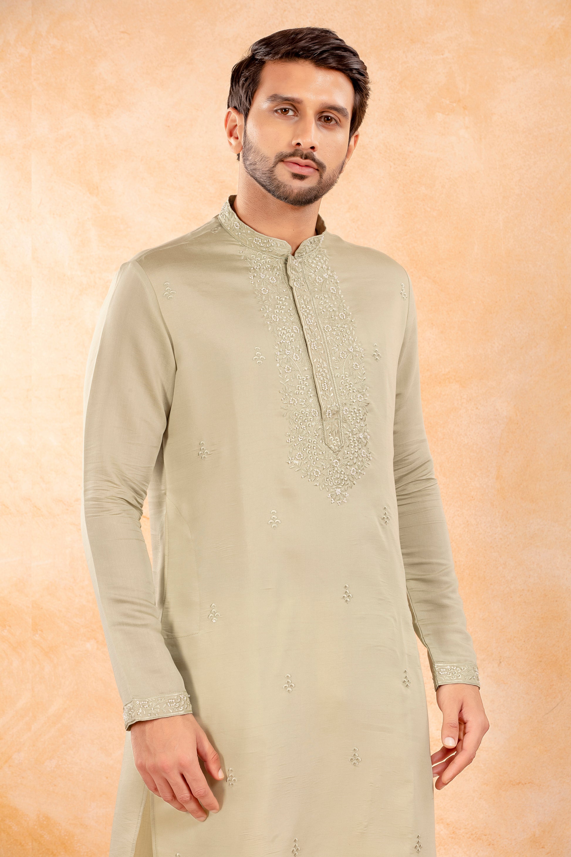 A light green kurta adorned with delicate tone-on-tone thread embroidery for an understated yet elegant look. The soothing hue and minimal detailing make it a perfect choice for daytime celebrations and festive gatherings.