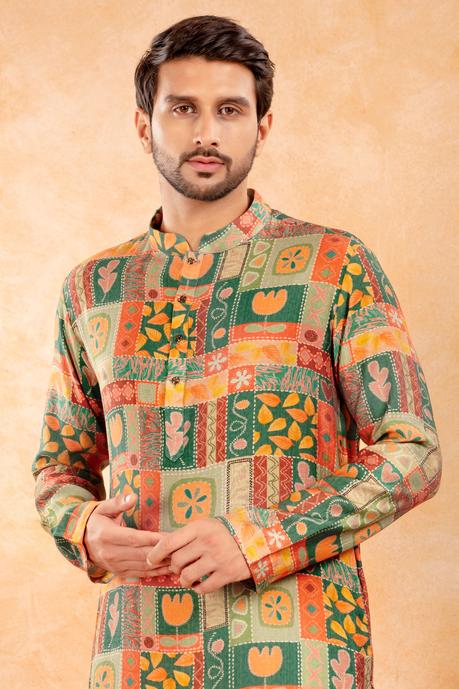 A vibrant printed kurta featuring a unique patchwork-inspired pattern in warm shades of orange, green, and mustard. Ideal for festive gatherings, cultural events, and joyful daytime celebrations.